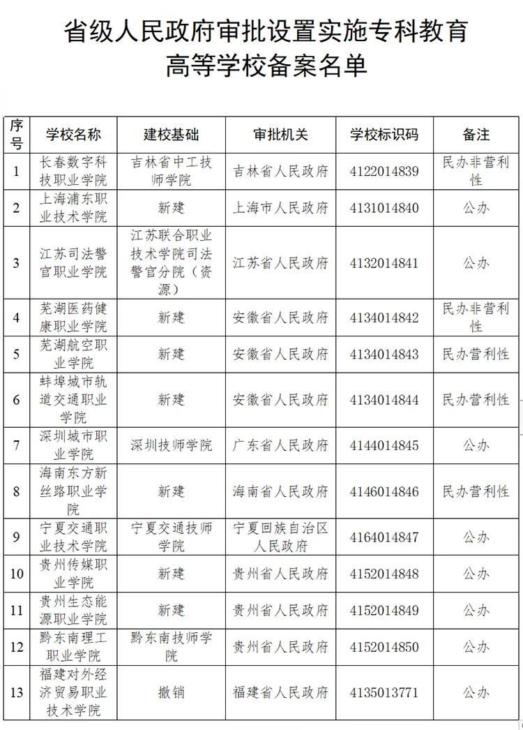 近日,教育部官网发布《关于公布2024年度第一批实施专科教育高等学校备案名单的函》,公布了省级人民政府审批设置的实施专科教育高等学校备案名单。具体名单如下: