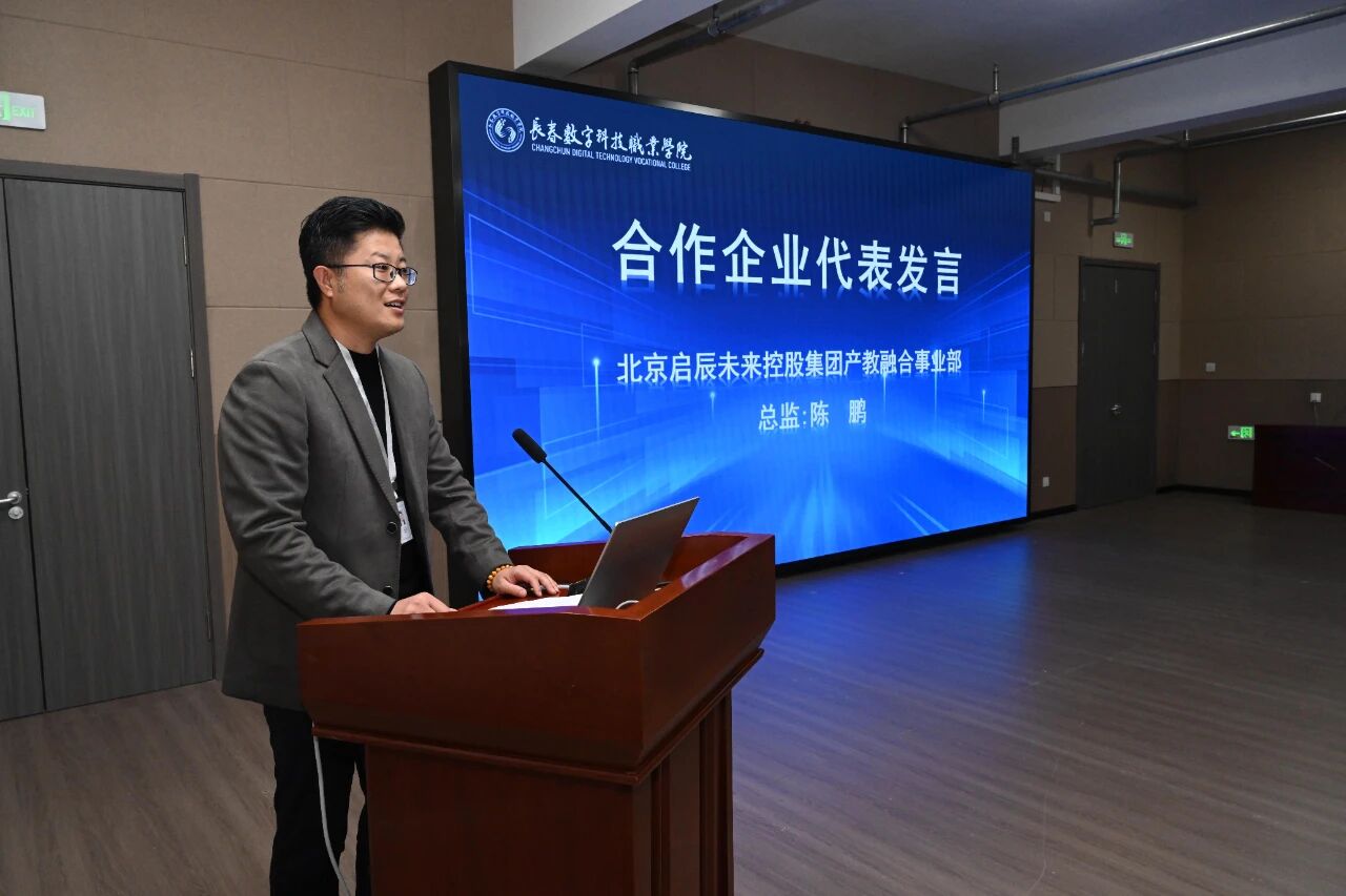 会上,与学校深度合作的两家企业代表进行了校企合作案例分享。中科曙光谢晓经理深入剖析人工智能政策与产业链,展望校企共建产业学院、开发课程、打造实训基地的规划,推动“岗课证赛”融通,助力学生掌握AI领域真本领。启辰京师紫荆陈鹏总监以“势、实、远”三字分享京师紫荆产业学院实践:“势”在顺应国家技匠培养需求,破解吉林医养健康人才缺口;“实”于构建“4链2基地6中心”体系,推动产教深度共生;“远”在打造人才培养标杆,赋能产业升级,实现“办好一个学院、带动一个产业、服务一方经济”的蓝图。