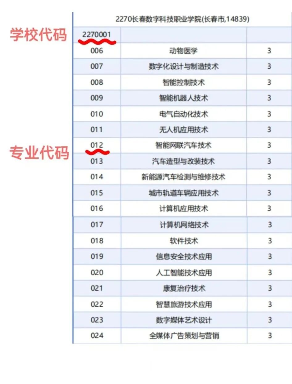 长春数字科技职业学院校报考代码为2270001;专业报考代码见计划表各专业前三位代码。