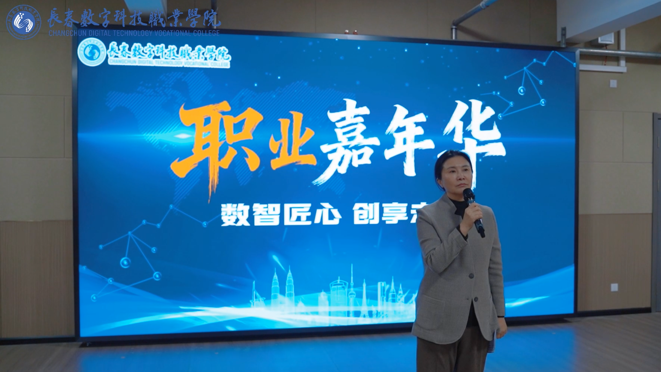 在启动仪式上徐超时主席郑重宣布“数智匠心·创享未来”长春数字科技职业学院首届职业嘉年华正式启动!启动仪式由副校长秦俭主持。