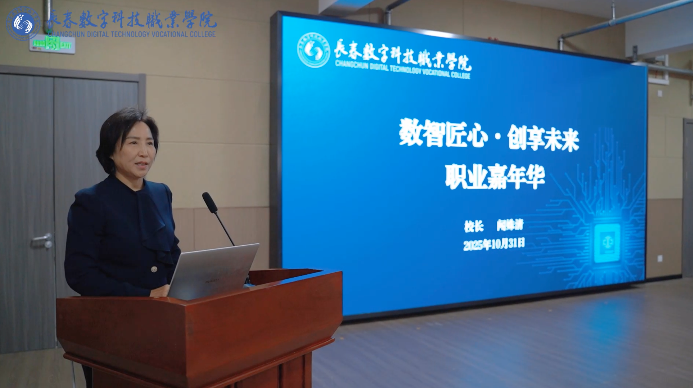 10月31日,长春数字科技职业学院校园里暖意融融,线上直播间与线下会场联动呼应,首届“数智匠心·创享未来”职业嘉年华启动仪式在一合楼403会议中心隆重举行。学校董事会主席徐超时、校长闻姝清、党委书记解双箭等全体校领导班子成员,各学院院长及全体教师与同学们齐聚一堂。