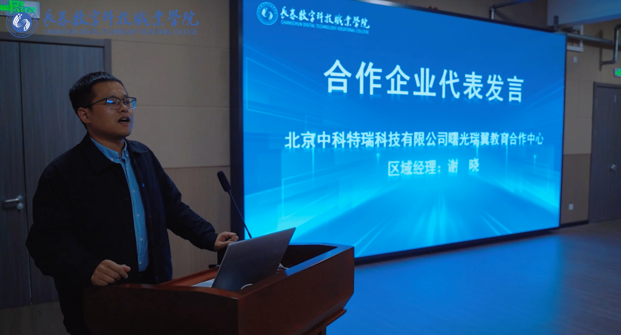 会上,与学校深度合作的两家企业代表进行了校企合作案例分享。中科曙光谢晓经理深入剖析人工智能政策与产业链,展望校企共建产业学院、开发课程、打造实训基地的规划,推动“岗课证赛”融通,助力学生掌握AI领域真本领。启辰京师紫荆陈鹏总监以“势、实、远”三字分享京师紫荆产业学院实践:“势”在顺应国家技匠培养需求,破解吉林医养健康人才缺口;“实”于构建“4链2基地6中心”体系,推动产教深度共生;“远”在打造人才培养标杆,赋能产业升级,实现“办好一个学院、带动一个产业、服务一方经济”的蓝图。